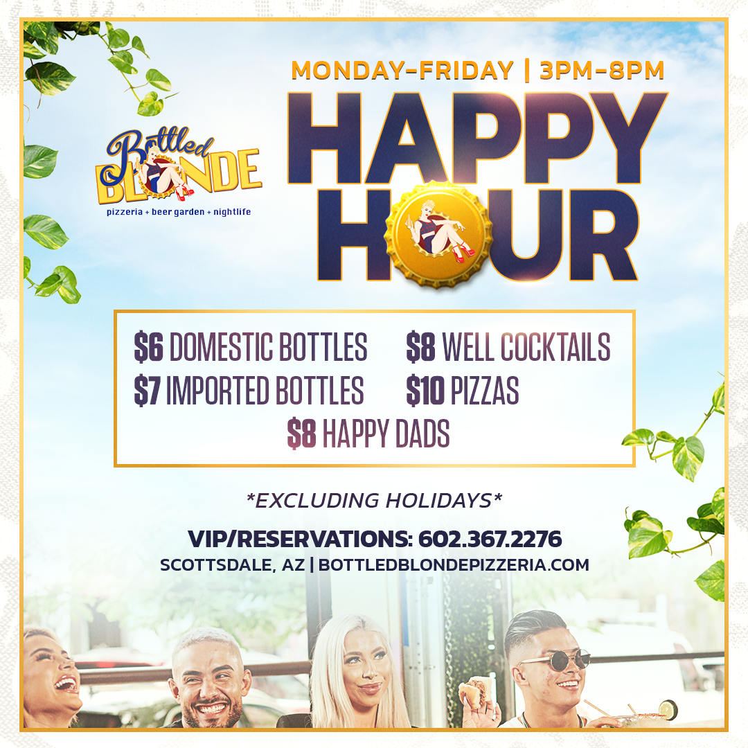 Come join us at Bottled Blonde in Old Town Scottsdale and kick off your evening the right way! Between 3 and 8PM every Monday through Friday, enjoy specially‑priced drinks and delicious bites in our relaxed patio and lounge space. Whether you're grabbing a craft beer, or our signature pizza, the vibes are laid‑back and the deals are solid. See you after 3!